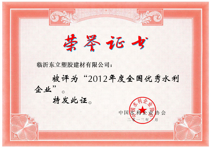 2012年度全國(guó)優(yōu)秀水利企業(yè)證